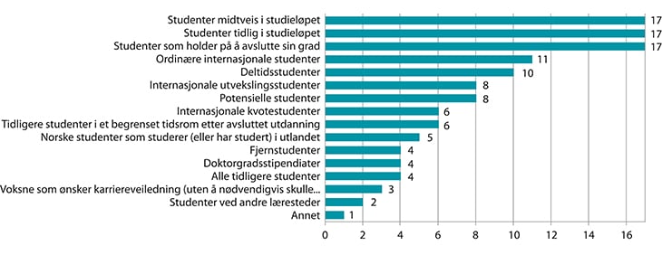 Karriereveiledningen i universitet og høyskoler er ikke et rettighetsfestet tilbud. Studentene velger selv om de ønsker å benytte seg av karrieretjenester. Det er opp til hver enkelt institusjon og hver enkelt karrieretjeneste å bestemme en praksis for hvem som skal ha tilgang til tjenestene. For å få tilgang til tjenester som kurs og veiledning må man som regel være registrert student og betale semesteravgift. Potensielle søkere til høyere utdanning får som regel ikke veiledning ved karrieretjenestene.9 Uteksaminerte studenter får tilgang til tjenestene i en begrenset periode. Ved noen læresteder har internasjonale studenter tilgang til tjenestene. Det er ulikt hvorvidt fjernstudenter har tilgang til veiledning. Ingen av de undersøkte karrieretjenestene har egne veiledningstilbud innrettet spesielt for minoriteter. Én tjeneste har eget tilbud for studenter med funksjonshemminger. Figuren under viser at institusjonene definerer flere ulike målgrupper for sine karrieretjenester.