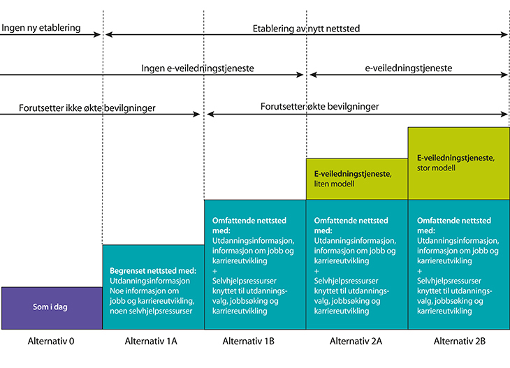 Bortsett fra når det gjelder informasjon om utdanningsmuligheter, er det nettbaserte offentlige karriereveiledningstilbudet i Norge begrenset, både når det gjelder kvalitet, omfang og type innhold. Det kan heller ikke sies å være utformet som et helhetlig tilbud. De tilbudene som finnes er spredt ut over flere nettsteder, de er i stor grad rettet mot spesifikke grupper og består hovedsakelig av informasjon. Det finnes ingen nasjonal, offentlig e-veiledningstjeneste. Det eksisterer noen åpent tilgjengelige selvhjelpsressurser, men kvaliteten på disse kan variere. Det er utviklet en del veiledningsplattformer for nettbasert prosessveiledning, men tilgangen til disse er som regel begrenset av at de er betalingstjenester. Innholdet på de eksisterende informasjonsnettstedene er i liten grad tilrettelagt for voksne i ulike livsfaser, for mennesker med spesielle behov eller med annet språk enn norsk. Tilbudet er som helhet i liten grad samordnet og det forvaltningsmessige og finansielle ansvaret er delt på flere ulike offentlige aktører.9