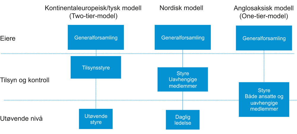 Hvilken modell som praktiseres i de enkelte landene, følger som regel av selskapslovgivningen.21 I Tyskland er det krav om at allmennaksjeselskap skal ha to styrer, et utøvende og et som fører tilsyn. Det utøvende består av medlemmer som er ansatt i virksomheten, mens styret som fører tilsyn skal bestå av medlemmer som er uavhengig fra administrasjonen. Tilsynsstyret oppnevner det utøvende styret og godkjenner store beslutninger. Dersom tilsynsorganet ikke godkjenner et forslag som er blitt lagt fram for godkjenning, kan det utøvende styret legge fram forslaget for generalforsamlingen.