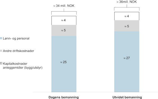 Figurforklaring: Figuren illustrerer omfanget av de viktigste kostandene i et hospice uten dagtilbud eller utadrettet virksomhet med 22 plasser. Kostnadene er vist i to situasjoner: en hvor hospicet har noe underdekning i bemanning, og en hvor det er full dekning.