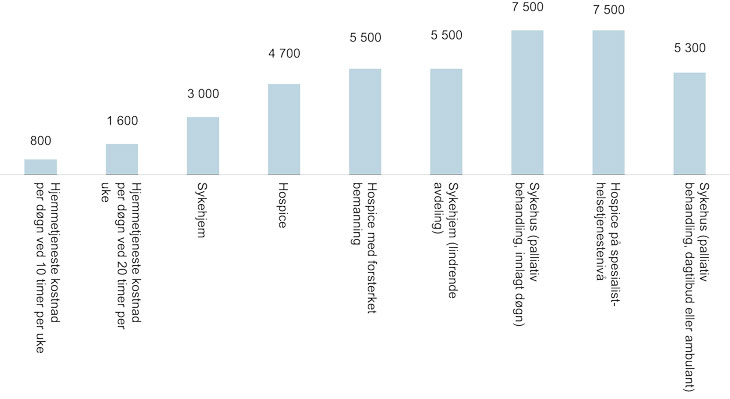 Sykehjem, lindrende avdeling (per plass per døgn) | 5 500 | 4 500 | 6 500 | Statistisk sentralbyrå og Helsedirektoratet |