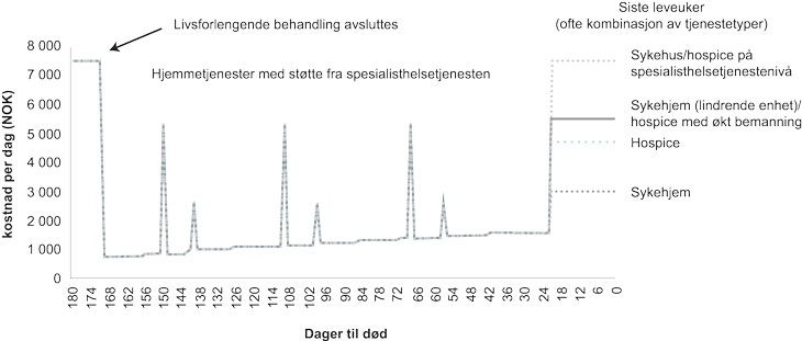 Figurforklaring: Figuren illustrerer kostnaden per dag over et forløp på 180 dager. Når livsforlengende behandling avsluttes og pasienten flytter hjem faller kostnaden (venstre i figuren). Videre får pasienten gradvis mer hjemmetjenester (illustrert med de små økningene i kurvene), og pasienten kan ha opphold på sykehus eller behandling på poliklinikken. Sistnevnte vil innebærer en betydelig økning i døgnkostnaden (illustrert med de store sprangene i kurvene). Frem til livets sluttfase antas kostnaden å være uavhengig av hvor pasienten avslutter livet. I livets sluttfase (her illustrerte som siste 3 uker) antas det at pasienten må ha fulltidspleie på sykehus, sykehjem eller hospice. Ofte vil pasienten motta en kombinasjon av tjenester fra primær- og spesialisthelsetjenesten.