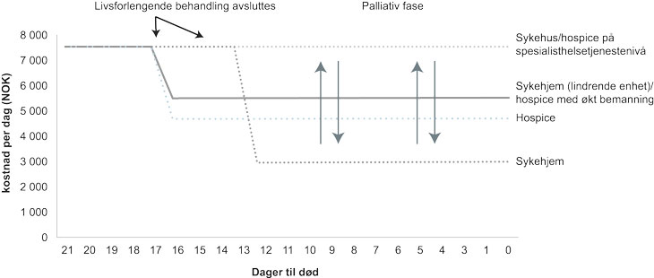 Figurforklaring: Figuren illustrerer kostnaden per dag for pasienter som ikke kan bo hjemme etter at livsforlengende behandling er avsluttet. Etter livsforlengende behandling kan pasienten fortsette oppholdet på sykehus eller bli overført til sykehjem/hospice. I enkelte tilfeller kan behandlingen på sykehus avsluttes tidligere hvis pasientene skal på en lindrende enhet (sykehjem) eller hospice, sammenlignet med situasjonen hvor pasienten skal på en vanlig sykehjemsavdeling. I palliativ fase vil mange pasienter flytte seg mellom behandlingstedene (illustrert med piler). For eksempel vi enkelte pasienter som er på sykehjem ha ett eller flere korttidsopphold på sykehus.