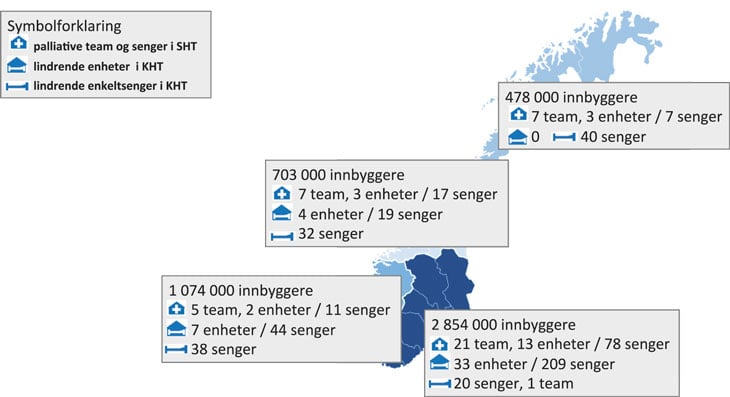 Helsedirektoratets fagrapport IS-2278 anfører at 40 helseforetak har et palliativt senter hver med ambulerende palliativt team. Disse teamene har en viktig funksjon i samhandlingen mellom nivåene i helsetjenesten. 21 av de palliative sentrene har også palliativ enhet, med til sammen 113 senger.
