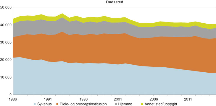 Når man sammenlikner tall fra 1987 med tilsvarende fra 2011, ser en at andelen som døde i sykehus sank fra 46 prosent i 1987 til 31 prosent i 2015. Andelen som døde i pleie- og omsorgsinstitusjoner økte samtidig fra 30 prosent til 48 prosent, mens andelen som døde hjemme var relativt stabil (15 prosent i 1987 og 18 prosent i 2011). De viktigste forklaringer til denne endringen er en aldrende befolkning og stor nedgang i antall dødsfall som skyldes hjerte-karsykdom (reduksjon fra 48 prosent til 29 prosent). Samtidig har andelen dødsfall forårsaket av kreftsykdom økt fra 22 prosent til 27 prosent (Kalseth og Theisen, 2017). De fleste dør av kreft og hjerte- og karsykdommer, men også demenssykdommer er blant de hyppigste dødsårsakene i sykehjem. De aller fleste som døde i sykehjem var i aldersgruppen 80–94 år. Hovedårsakene til dødsfall i sykehjem er kreft (27,6 pst.), hjerte- og karsykdommer (26,6 pst.) og demens (15,2 pst.) (Folkehelseinstituttet, 2016).