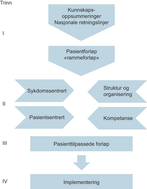 Denne overordnede analysen og den påfølgende planen skal tilpasses den enkelte pasient, se figur 6.1. Trinn 1 innebærer at nasjonale retningslinjer er utarbeidet og rammene om et pasientforløp er skissert. Når trinn I er gjennomført, må man vurdere hva som er tilgjengelig av struktur/organisering og kompetanse innen sykehus, den kommunale helse- og omsorgstjenesten og hvordan de to nivåene skal samarbeide. Den andre delen av trinn II skal bestå av en individuell vurdering av hver pasient, både med et sykdomsfokus og et pasientsentrert fokus. Under disse vurderingene blir den pasienttilpassede dimensjonen lagt til de standardiserte «rammeforløpene». Dette blir samlet, det pasienttilpassede forløpet (trinn III). Når man har kommet til trinn III må det påses at det pasienttilpassede forløpet blir fulgt i praksis, med andre ord implementert. Deretter må det påsees at det pasienten, sammen med legen og andre i det tverrfaglige teamet er enige om innholdet og at blir brukt i klinisk praksis.