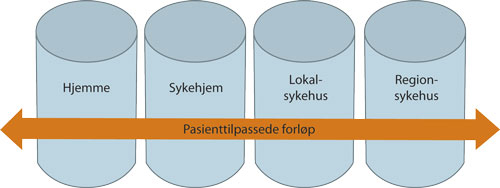 Utvikling av helhetlige pasientforløp er et av samhandlingsreformens viktigste mål (St.meld. nr. 47 (2008–2009)). Den tradisjonelle organiseringen av helsetjenesten i «siloer» innad og mellom nivåer er en utfordring for gode pasientforløp og en lite hensiktsmessig måte å forvalte totalressursene på. Med siloer menes her egne organisatoriske enheter i den kommunale helse- og omsorgstjenesten og i spesialisthelsetjenesten. Samhandlingsreformen viste til at helsetjenesten har mange systemer som er rettet mot deltjenestene, og i liten grad systemer som støtter pasientens behov for helhet i pasientforløpet. Det er også en stor utfordring at helsepersonell er organisert i hver sin silo, med egne budsjetter, mens pasientforløpene går på tvers av siloene, se figur 6.2. Pasientforløp med klart ansvar for hvert delforløp og nødvendig ressurssetting er den metoden som best kan bygge broer mellom siloene. Figur 6.2 Pasientforløp på tvers av siloer
