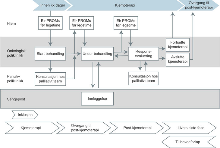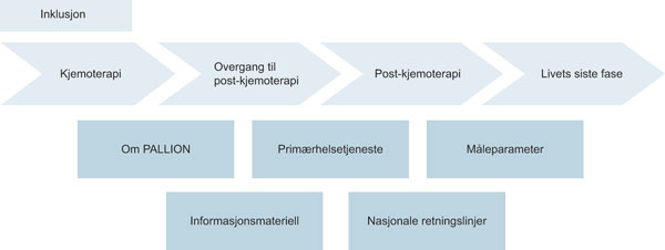 I pallion er det formalisert et samarbeid mellom onkologisk poliklinikk og palliativ poliklinikk basert på Pallionforløpene. Et annet element i Pallion er integrering av palliasjon inn i forløpet mens pasientene får livsforlengende kjemoterapi (se figur 6.3).