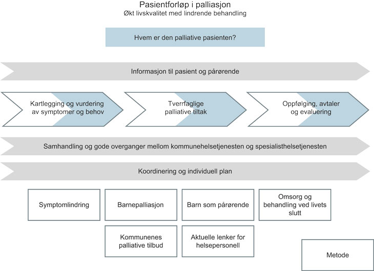 Pasienter med behov for palliasjon får helsehjelp og omsorg i alle deler av helse- og omsorgstjenesten, ofte fra flere aktører samtidig. I dag møter mange pasienter et utrednings- og behandlingstilbud som er preget av for store uønskede variasjoner og som er fragmentert (St. meld. nr. 47 (2008–2009)). Gode planer, forutsigbarhet og pasientinvolvering er sentrale elementer som er etterspurt i dagens helsetjeneste. Det forventes at pasientene får et likeverdig tilbud uavhengig av hvor de bor. Nasjonale faglige retningslinjer skal bidra til dette. Innholdet i de faglige retningslinjene skal være basert på den beste forskningen internasjonalt. Derfor bidrar retningslinjene også til at behandlingen og omsorgen norske pasienter får, holder høyt nivå internasjonalt og har god kvalitet.