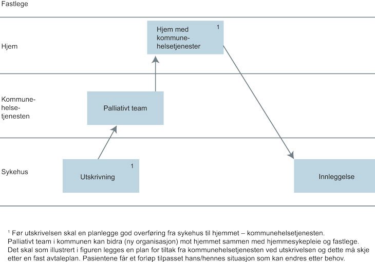 Pasienter med behov for palliative tjenester vil ofte trenge hjelp fra spesialisthelsetjenesten, fastlegen og den kommunale helse- og omsorgstjenesten samtidig. En forløpstilnærming må synliggjøre hvilke aktører og ressurser som skal bidra gjennom hele forløpet. Det vil være behov for ulike typer personell i de ulike fasene i et forløp, og det vil være behov for tverrfaglig samarbeid. I enkelte tilfeller vil familien bidra til å pleie pasienten sammen med hjemmesykepleien og palliativt team. Det palliative teamet kan enten være et kommunalt palliativt team eller et palliativt team fra spesialisthelsetjenesten, avhengig av sykdommens kompleksitet og behovene til pasienten og familien. God planlegging er en forutsetning for å utnytte den faglige kompetansen optimalt.