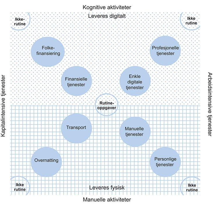 De fleste delingsøkonomitjenester involverer bruk av arbeidskraft i større eller mindre grad. Selv kapitalintensive tjenester som utleie av bolig eller bil krever arbeidsinnsats i form av oppfølging av kunder, vedlikehold og rengjøring. Andre tjenester er mer arbeidsintensive, slik som bilkjøring eller rengjøring. I figur 5.1 er de mer arbeidsintensive tjenestene plassert til høyre, mens de mer kapitalintensive er plassert til venstre. Det skilles videre mellom tjenester som leveres fysisk (nederste halvdel av figuren) og tjenester som kan og blir levert digitalt (øverste halvdel). Tjenestene har også ulik grad av rutinearbeid, illustrert ved avstanden til midten.