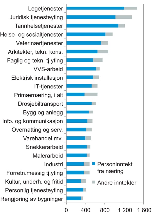 I det norske arbeidslivet er det mest vanlig å være selvstendig næringsdrivende i landbruket, innenfor kultur, innenfor faglig, vitenskapelig og teknisk tjenesteyting og i bygg og anlegg. Selvstendig næringsdrivende er en sammensatt gruppe, jf. figur 5.2. I den øvre enden av inntektsskalaen finner vi høyt utdannede grupper som leger og advokater, mens personer som driver med personlig tjenesteyting, rengjøring og tjenester innenfor kultur, underholdning og fritid, har lavest inntekt (se også Fafo, 2016 og Grünfeld m.fl., 201610).