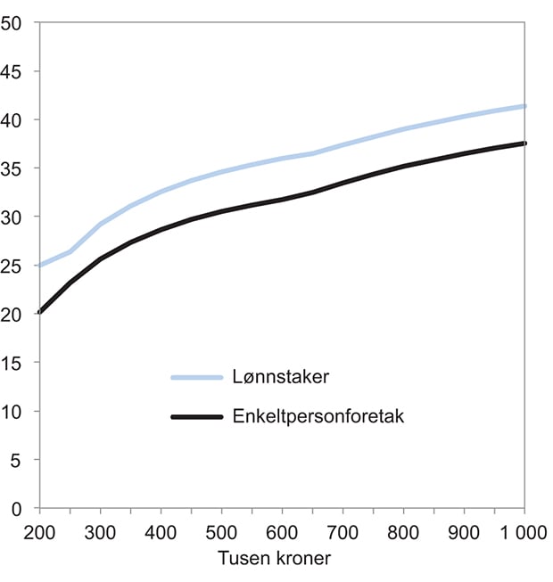 Bidraget til finansiering av folketrygdens utgifter gjennom trygdeavgiftene er lavere for selvstendig næringsdrivende enn innbetalingene for arbeidstaker fra arbeidsgiver/arbeidstaker. Mens arbeidstakere/-givere betaler både arbeidsgiveravgift (gjennomsnittssats 13 pst.) og trygdeavgift (8,2 pst.), betaler selvstendig næringsdrivende kun trygdeavgift (11,4 pst.). Forskjellen mellom innbetalingene for arbeidstakere og selvstendig næringsdrivende gjennom trygdeavgiftene utgjør dermed 9,8 pst. av inntektsgrunnlaget. Folketrygdens ytelser finansieres av et statstilskudd i tillegg til trygdeavgift og arbeidsgiveravgift. Gjennomsnittlig skattebelastning for selvstendig næringsdrivende er gjennomgående lavere enn for lønnstakere, jf. figur 5.3.