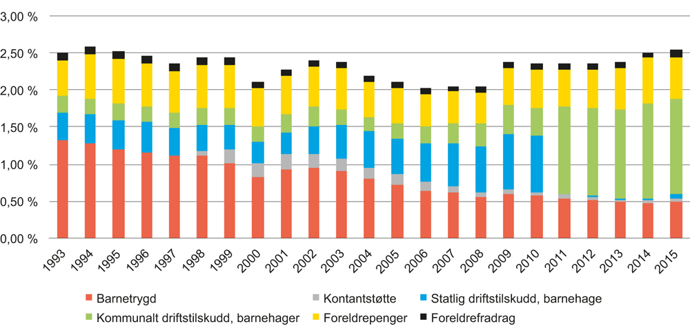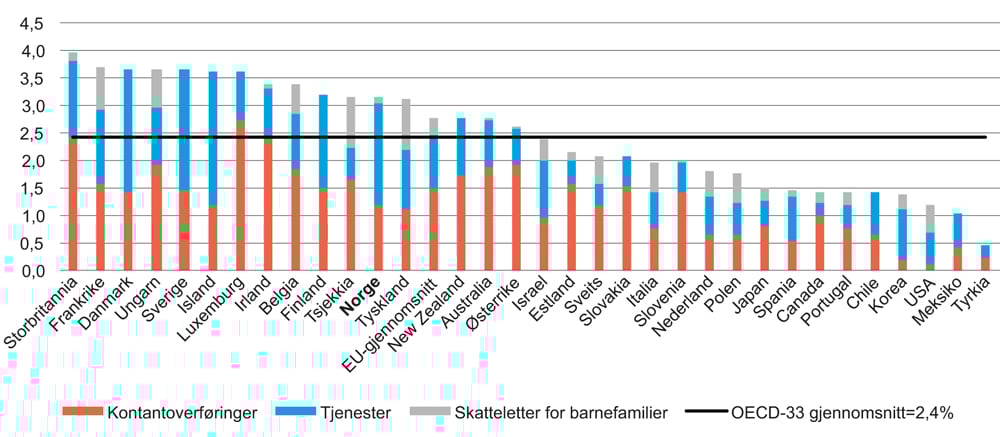 Virkemidlene i familiepolitikken kan grovt sett deles inn i kontantoverføringer, støtte via skattesystemet og subsidier av tjenester. I figur 1.1 vises det hvordan disse tre hovedkategorier av støtteordninger ble brukt i ulike land i 2013. Norge plasserer seg noe over OECD-gjennomsnittet i bruk av overføringer til barnefamilier, med omtrent 3,2 prosent av BNP, men ligger lavere enn de andre nordiske landene. En ser fra dekomponeringen at særskilt behandling (av barnefamiliene) via skattesystemet har liten betydning i samtlige land, men at fordelingene mellom tjenester og kontantoverføringer varierer. I likhet med de andre nordiske landene, er andel av støtten som går gjennom tjenester relativt høy i Norge.