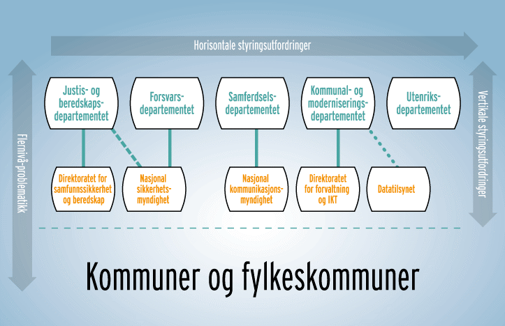 Digitaliseringen av samfunnet skjer i alle sektorer og på alle nivåer. Det gjør IKT-sikkerhet til et tverrsektorielt politikkområde. I forvaltningen har hver enkelt statsråd et overordnet ansvar for å ivareta IKT-sikkerheten i sin egen sektor.1 Justis- og beredskapsdepartementet har imidlertid et samordningsansvar for IKT-sikkerhet i sivil sektor og skal utforme regjeringens politikk på området.2 Politiske målsettinger som angir retning og styring på området, kan komme i konflikt med andre målsettinger, både sektorvise og tverrsektorielle.