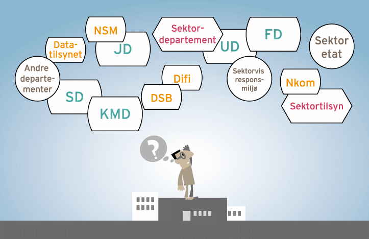 I informasjonen utvalget har hentet inn, kommer det til uttrykk at brukerne er usikre på hvor de skal henvende seg for å få råd og veiledning om IKT-sikkerhet. Dette kan tyde på at det mangler en tydelig stemme eller ett kontaktpunkt som brukerne opplever er det rette stedet å henvende seg. Det kan også tyde på at det er uklart for brukerne hva de ulike etatene har ansvaret for. Fra et brukerperspektiv kan det være krevende å forholde seg til mange aktører (se figur 9.1).