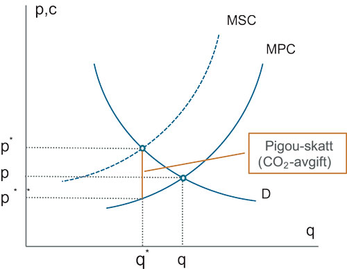 Ei auke i kostnaden ved utslepp står uansett sentralt i verkemiddelapparatet. Her fell tankesettet langt på veg saman med ideen om Pigou-skattar, der målet er å jamne ut forskjellen mellom privatøkonomiske kostnadar ved bruk av fossile brensel og kostnaden dei skapar for samfunnet. Figur 1 illustrerer tilbod, etterspurnad og prisdanning i ein enkel marknadsmodell med fullkomen konkurranse. I ein frikonkurransemarknad vil etterspurnad (D) reflektere den private nytta av siste konsumerte eining, medan tilbodet (MPC) vil representere kostnaden for produsentar ved å produsere ei eining ekstra. Resultatet blir ei likevekt som legg fast marknadsprisen (p) og omsett kvantum (q). Med fullkomne marknadar vil grensekostnaden for private produsentar vidare være lik grensekostnaden for samfunnet (MPC = MSC), og marknadslikevekta er dermed optimal i samfunnsøkonomisk forstand.