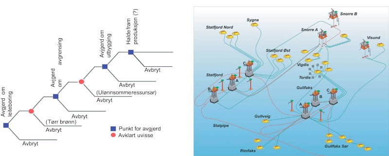 Teorien om realopsjonar bygg på tankesettet rundt finansielle opsjonar. 5 Ein realopsjon er definert som ein rett – utan plikt – til eit forretningsmessig initiativ. For olje- og gassnæringa kan aktuelle døme være initiativ til leiteboring, iverksetting av feltutbygging, utsetting av investeringar, utviding av produksjonskapasitet og nedstenging av felt. Dette er illustrert i figur 6.3, der den venstre delen viser eit tre av avgjerder og avklaring av uvisse i verdikjeda frå leiting og funn til nedstenging. På kvart punkt i treet fattar selskapet nye avgjerder basert på avklart uvisse og ny informasjon. Dermed ser ein korleis den grunnleggande verdikjeda i oppstrøms olje- og gassproduksjon kan studerast som ei kjede av realopsjonar.
