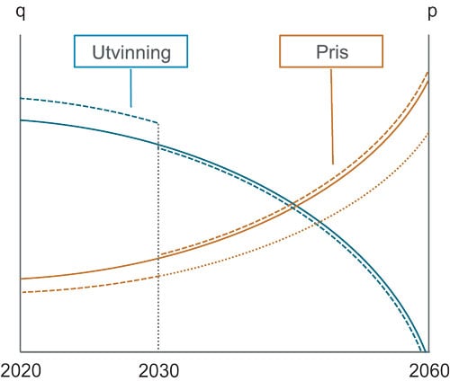 Figur 6.4 gjev ein stilisert illustrasjon av hovudmekanismen bak det grøne paradokset med utgangspunkt i ei tilpassing av utvinning og prisutvikling i tråd med Hotelling-teori. Ressursane er avgrensa, og utvinninga er i utgangspunktet tilpassa slik at potensialet er uttømt innan 2060. I vår samanheng kan ei slik skranke alternativt tolkast med utgangspunkt i eit karbonbudsjett. Figuren visar korleis utviklinga i produksjon og prisar ved ei annonsering i dag om ei innstramming i klimapolitikken frå 2030. Nærmare bestemt er det føresett innføring av ei CO2-avgift på fossile brensel. Resultatet er at utvinning blir skyve fram i tid, slik at tilbodet stig og prisen fell i perioden fram mot 2030. Deretter fører sjølve implementeringa til ei justering i motsett retning, slik at produksjonen på lang sikt blir lågare enn utan klimapolitiske tiltak, og prisbanen blir høgare. Dette skyldast at ein akselerasjon i utvinning på kort sikt skapar større knappleik på lang sikt.