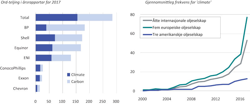 Samstundes har merksemda rundt klimarelatert risiko blitt større frå oljeselskapa si side. Utan rapporteringskrav eller standardar er det krevjande å måle denne utviklinga. Ein indikasjon kan ein likevel få gjennom tekstanalysar av årsrapportar frå oljeselskapa. Figur 6.5 rapporterer hovudtal frå ei oppteljing av orda ‘climate’ og ‘carbon’ (inkl CO2) frå årsrapportane til åtte store oljeselskap frå årtusenskiftet og fram til og med 2017. Det venstre panelet tydar på at desse omgrepa er mest brukt av europeiske selskap, med Total i spissen. Det høgre panelet illustrerer utviklinga i den gjennomsnittlege førekomsten av omgrepet ‘climate’ i årsrapportane sidan 2000. Igjen ser ein at klimaet blir via mest merksemd av europeiske oljeselskap, men at bruken av slike omgrep er på veg oppover og blant dei tre amerikanske oljeselskapa gjennom dei siste åra.
