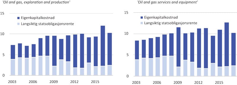 Note: For perioden 2003 – 2015 illustrerer figurane utviklinga i estimert eigenkapitalkostnad for to sektorar i den amerikanskje aksjemarknaden, nemleg «Oil and gas, exploration and production» og «Oil and gas, services and equipment». I tillegg gjev figurane illustrasjon av utviklinga i risikofri rente («langsiktig statsobligasjonsrente») gjennom den same perioden.