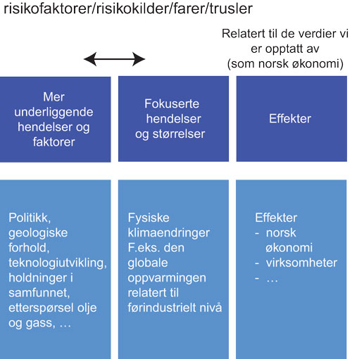 Det er vanlig å skille mellom hendelser/størrelser på et relativt overordnet nivå og mer underliggende risikofaktorer eller risikokilder, se figur 2. Skillet gjøres for å gi ryddighet i analysearbeidet og fremstillingen av risiko, men det er viktig å være oppmerksom på at dette er relative begreper. En risikofaktor kan være en overordnet fokusert hendelse i en annen risikovurdering. En endring i teknologiutviklingen kan sees på som en risikofaktor for hendelsen fysiske klimaendringer, men kan også være en hendelse i seg selv dersom vi ønsker å studere mer i detalj hvordan endringer i teknologiutviklingen kan oppstå. Tilsvarende kan et politisk klimavedtak sees på som en risikofaktor for en fysisk klimaendring, men også være en mer overordnet hendelse dersom målet er å se nærmere på hva som må til for å få til et spesifikt politisk vedtak. Det er interaksjon mellom de to nivåene. Politiske vedtak påvirker de fysiske klimaendringene, og omvendt.