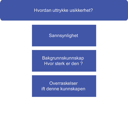 For å uttrykke usikkerhet ledes vi følgelig til tre nivåer: sannsynligheter, kunnskapen den bygger på og styrken på denne kunnskapen, og overraskelser relatert til denne kunnskapen, se figur 3.