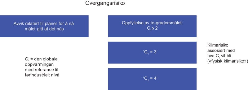 Ofte diskuteres risikoen med basis i at en skal nå to-gradsmålet. Referanseverdien kan da være C1 ≤ 2 og det er avvik i forhold til denne som inngår i risikobeskrivelsen. Som nevnt ovenfor kan en også ‘låse’ C1 ≤ 2 og la vurderingene være betinget at dette målet faktisk nås. Risikobeskrivelsen er da ikke komplett da usikkerhet og risiko relatert til å nå to-gradsmålet blir ignorert. Referansen blir planlagt løp mot dette målet som gitt for eksempel i Paris-avtalen. Risikoen avspeiler avvik i forhold til de forutsetninger og planer som Paris-avtalen setter, med tilhørende usikkerhet. Se figur 4 som illustrerer disse poengene.