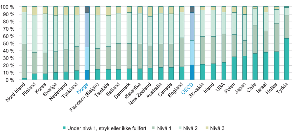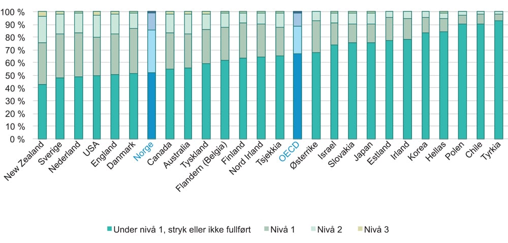 Norge har her relativt gode resultater i PIAAC sammenlignet med gjennomsnittet for OECD. Likevel er det 13 prosent av befolkningen i alderen 16–24 år som skårer lavere enn nivå 1 i PIAAC-testen, som stryker på den innledende kvalifiseringstesten eller som ikke ønsker eller klarer å fullføre testen.