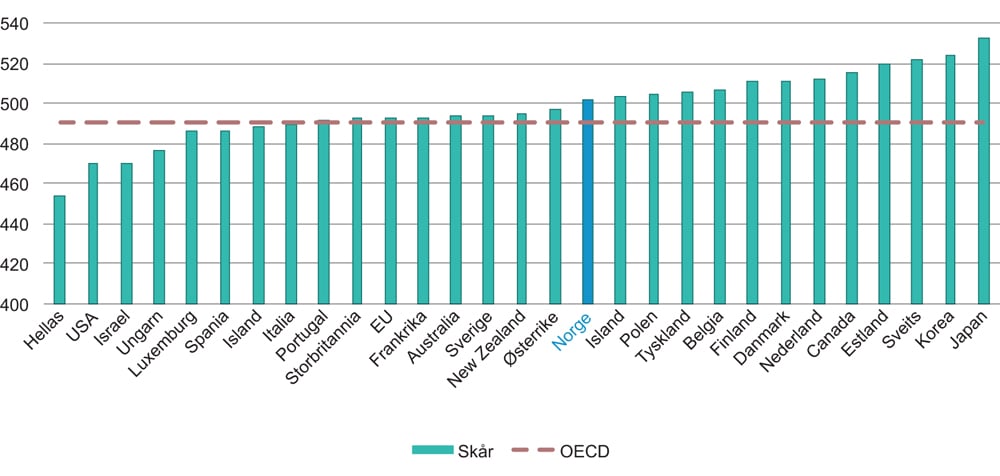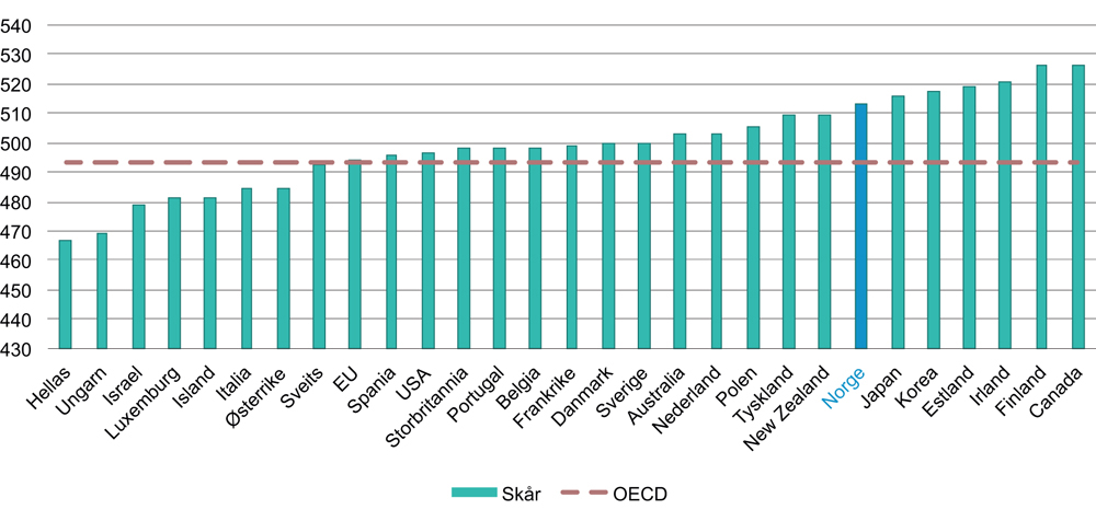Siden 2000 har OECD hvert tredje år gjennomført ferdighetstester for 15-åringer i PISA-undersøkelsen. For Norge har resultatene for lesing ligget over OECD-snittet siden 2000, bortsett fra i 2006, da vi falt under gjennomsnittet. I naturvitenskap lå Norge i 2015 for første gang over snittet for OECD. I matematikk har Norge for det meste ligget under snittet frem til 2012, bortsett fra i 2009. I 2015 lå vi over snittet også i matematikk, se figur 2.11. Likevel ser vi at vi har dårligere resultater enn flere land vi normalt sammenligner oss med, blant annet Danmark og Finland (OECD 2018) .