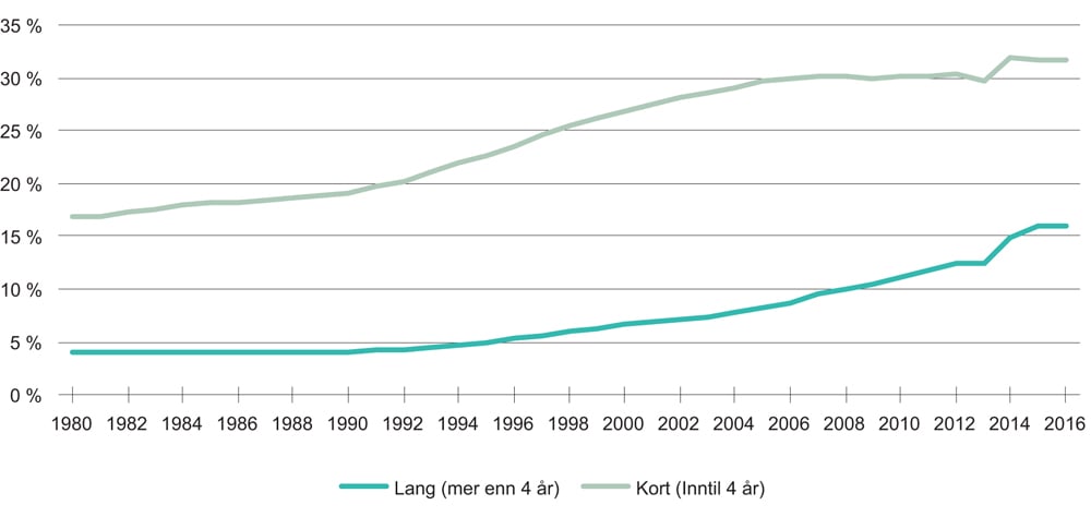 Figur 2.3 Andel av befolkningen med kort og lang universitets- og høyskoleutdanning. Alder 25–34 år. 1980–2016