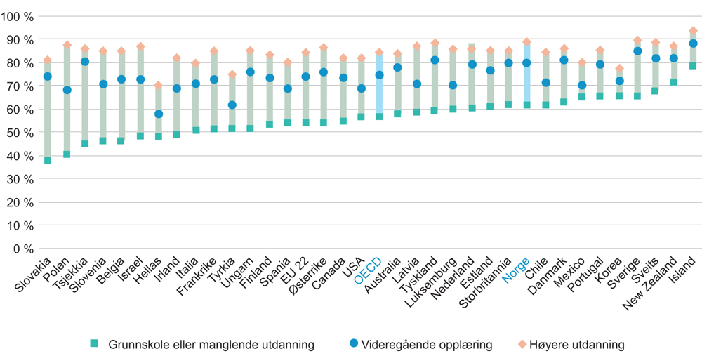 Norge har et høyt sysselsettingsnivå sammenlignet med andre land og også en høy andel med høyere utdanning. Men vi har også en høy andel (19 prosent) med grunnskole som høyeste utdanning. Blant OECD-landene er det bare seks land som har en høyere andel på dette utdanningsnivået. Det er relativt få som har videregående opplæring som høyeste fullførte utdanning i Norge.