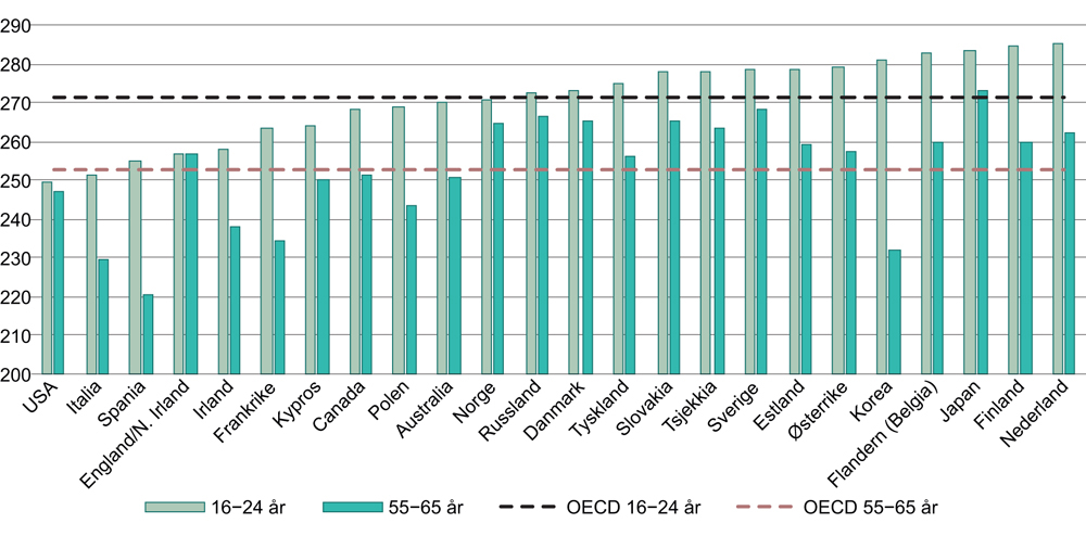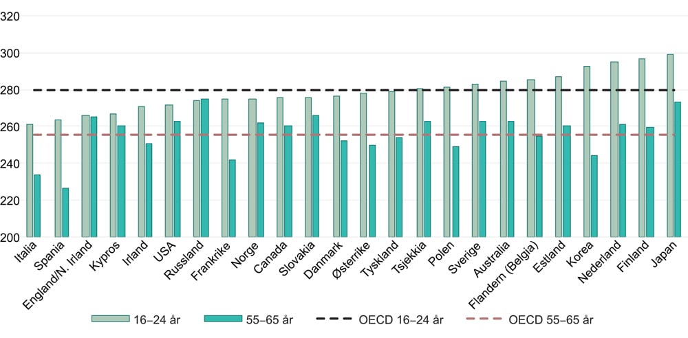 PIAAC-undersøkelsen måler leseferdigheter, tallforståelse og problemløsningsevne blant voksne i OECD-landene. Figur 2.7 viser hvordan Norges befolkning skårer på leseferdigheter sammenlignet med andre land. Gjennomsnittsskår for voksenbefolkningen i Norge i lesing er godt over OECD-gjennomsnittet. Dette gjelder særlig for aldersgruppen 55–65 år, hvor vi utmerker oss. Det kan være et uttrykk for at Norge har et relativt høyt utdanningsnivå blant eldre voksne, men også at utdanningssystemet som denne aldersgruppen ble opplært i var av god kvalitet, og/eller at det er stor læringsintensitet i det norske arbeidslivet.