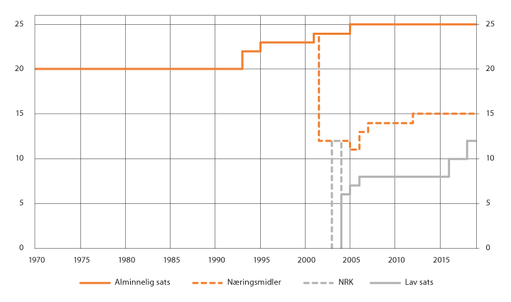 Fra 2004 ble det innført en lav sats i merverdiavgiften, som først ble satt til 6 pst. NRKs allmennkringkastingsvirksomhet, som var tatt inn i avgiftssystemet fra 1. januar 2003 med halv sats på 12 pst.2, fikk fra 1. januar 2004 den lave satsen. En begrunnelse for å inkludere NRK i avgiftssystemet var å gi NRK fradragsrett for inngående avgift på sine anskaffelser. Fradragsretten ville fjerne det avgiftsmessige insentivet til egenproduksjon fremfor eksternt innkjøp av innhold. Fra 1. mars 2004 omfattet den lave satsen også persontransport. Satsen på 6 pst. for persontransport medførte et inntektstap for staten, og i tillegg kom økt budsjettstøtte til riksvegferjene. Avgiftsplikt for persontransport var ment å legge grunnlag for reduserte billettpriser på offentlig kommunikasjon. Fra 1. januar 2005 ble både den alminnelige og den lave satsen økt med én prosentenhet til henholdsvis 25 pst. og 7 pst., mens den reduserte satsen for næringsmidler ble satt ned med én prosentenhet til 11 pst. Merverdiavgiftsunntaket for romutleie i hoteller mv. ble avviklet fra 1. januar 2006. Overnattingstjenester ble innlemmet i den lave satsen, som samtidig ble satt opp til 8 pst. For næringsmidler ble satsen økt to prosentenheter til 13 pst., begrunnet blant annet med at satsreduksjonen året før i liten grad hadde kommet konsumentene til gode. Fra 1. juli 2010 ble unntakene for museer, gallerier, fornøyelsesparker, opplevelsessentra mv. avviklet. Også disse fikk merverdiavgift med lav sats. De siste årene har den alminnelige satsen ligget fast på 25 pst., mens både satsen for næringsmidler og den lave satsen er satt opp i flere trinn. I 2019 er satsen for næringsmidler på 15 pst., og den lave satsen for persontransport, overnattingstjenester, kulturtjenester mv. er på 12 pst.