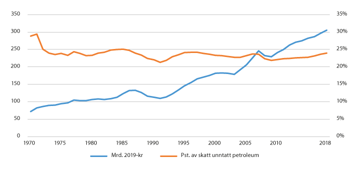 Merverdiavgiften står for en vesentlig del av skatteinntektene. Figur 3.2 viser inntektene av merverdiavgiften i 2018-kroner (venstre akse) og merverdiavgiften som andel av samlede skatter og avgifter unntatt petroleumsvirksomheten (høyre akse). Som andel av samlede skatter og avgifter gikk inntektene fra merverdiavgiften betydelig ned de første årene etter 1970, selv om det var solid vekst også i merverdiavgiftsinntektene. Nedgangen skyldtes at trygde- og pensjonspremiene i skattesystemet, blant annet arbeidsgiveravgiften, ble trappet kraftig opp for å finansiere Folketrygden, som var innført i 1967. Fra midten av 1970-årene har merverdiavgiften stått for mellom 22 pst. og 25 pst. av samlede skatter og avgifter unntatt petroleumsskatter og -avgifter.