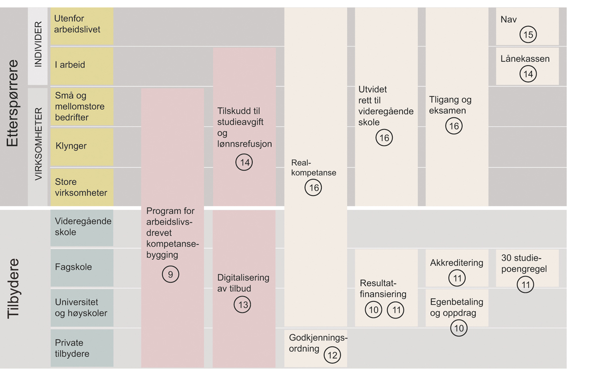Noen tiltak er innrettet mot flere målgrupper og krysser derfor flere rader, slik som Program for arbeidslivsdrevetkompetansebygging og Realkompetanse. Andre tiltak er innrettet mot bare én målgruppe, slik som Godkjenningsordning og Nav. Tiltakene er ikke nødvendigvis viktigere fordi de er innrettet mot mange grupper, og størrelsen på boksene reflekterer ikke betydningen eller kostnaden av tiltakene.