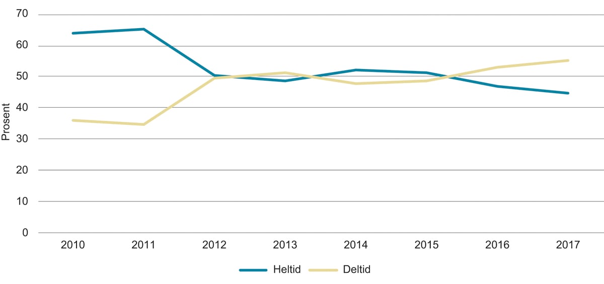 Fafo finner at midlertidige ansettelser, utleie av arbeidskraft og selvstendig næringsdrivende/oppdragstagere utgjør i underkant av tolv prosent av alle sysselsatte, og at andelen var stabil i perioden 2009–2014 (Nergaard, 2016). Bekkelund (2018) diskuterer om fast ansettelse slik vi kjenner det i dag kan bli mindre vanlig, og om koblingen mellom arbeidstager og bedrift vil bli løsere. Da vil bedrifter i større grad hente arbeidskraften de trenger, når de trenger den.