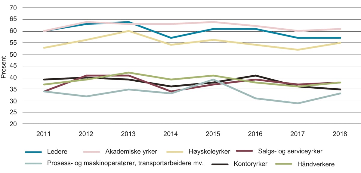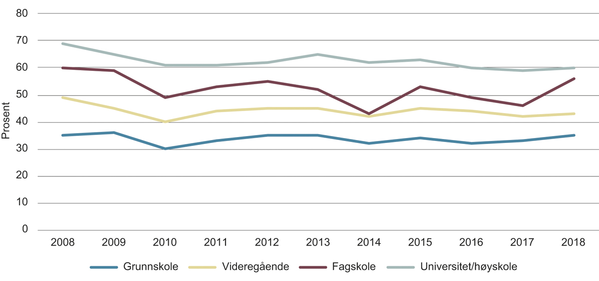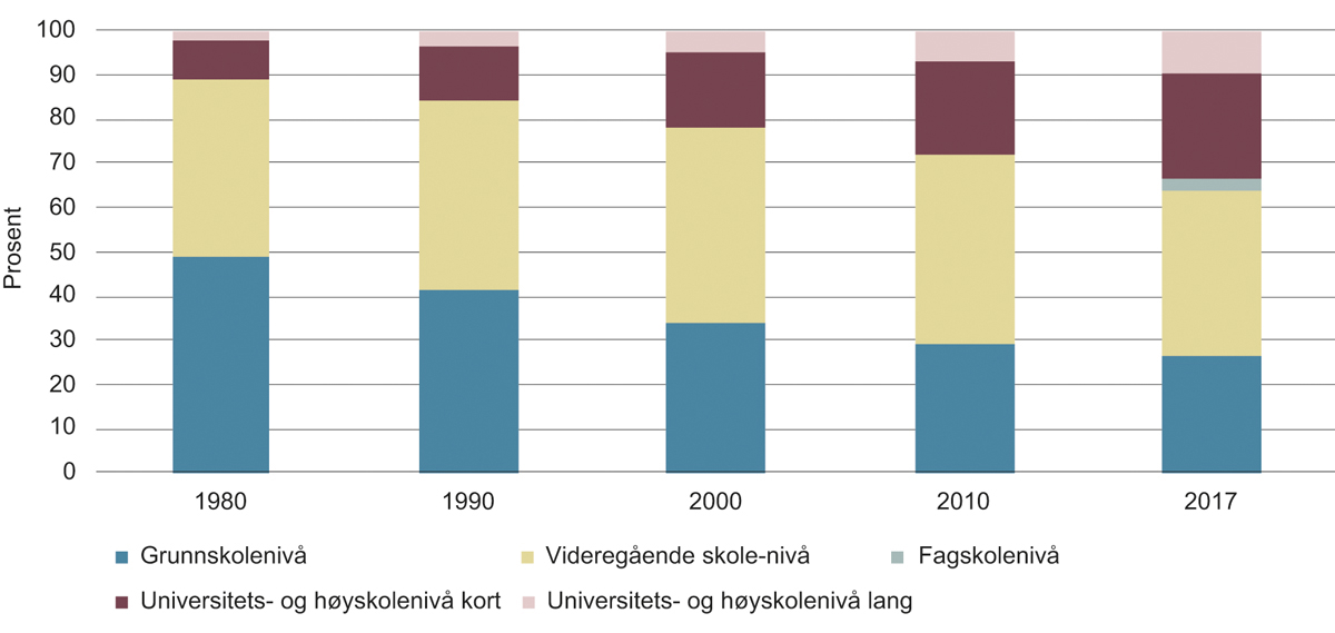 Grunnskole er obligatorisk og gratis for alle i Norge. All utdanning utover grunnskole er individets eget valg, men alle har lovfestet rett til gratis videregående skole. I løpet av de siste 40 årene har det vært en betydelig økning i befolkningens formelle kompetanse, og økningen har vært størst blant kvinner. Som illustrert i figur 3.1 hadde omtrent halvparten av befolkningen grunnskole som høyeste fullførte utdanning i 1980. Samtidig hadde omtrent 40 prosent videregående opplæring eller fagskole som høyeste fullførte utdanning. Tallene for 2017 viser at det har vært en betraktelig nedgang i antall personer som har grunnskole som høyeste fullførte utdanning, til fordel for økt grad av høyere utdanning på universitet- og høyskolenivå. Økningen har vært på 20 prosentpoeng fra 1980–2017, og i dag har omlag en tredjedel av Norges befolkning høyere utdanning. I 2017 hadde over 37 prosent av kvinner universitets- og høyskoleutdanning, mot 30 prosent av menn (Nygård, 2018). Selv om en stor andel av Norges befolkning har høyere utdanning, er det ikke ulikt andre OECD-land (NOU 2018: 2). Fortsatt har nesten en fjerdedel av befolkningen fortsatt kun grunnskole som høyeste fullførte utdanning. Figur 3.2 viser utviklingen i utdanningsnivået i den norske befolkningen over tid.