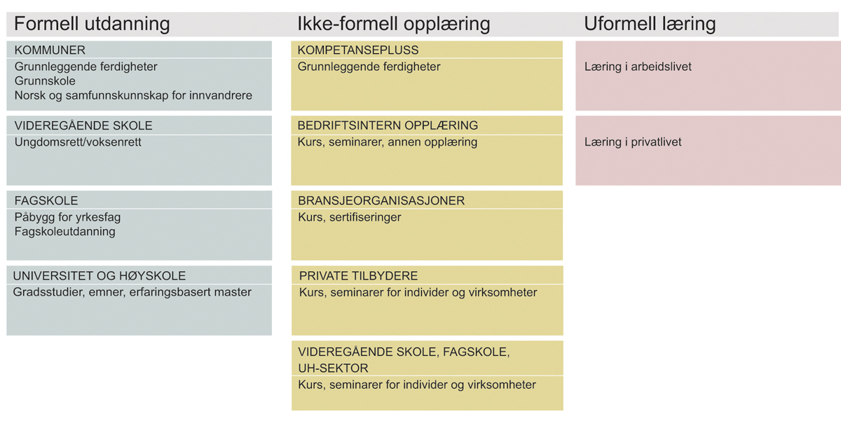 I dette kapitlet beskrives tilbyderne av livslang læring i Norge, og ulike tiltak som er iverksatt for å stimulere disse. Figur 3.4 gir en forenklet oversikt over tilbydere av livslang læring. Formell utdanning tilbys av de offentlige utdanningsaktørene, samt akkrediterte private tilbydere på ulike nivåer. Markedet for ikke-formell opplæring er mindre oversiktlig og omfatter svært mange private tilbydere, studieforbund, tilbud i regi av bransjeorganisasjoner og bedriftsintern opplæring. Enkelte tilbud om opplæring i grunnleggende ferdigheter finansieres innenfor Kompetansepluss-ordningen hvor private aktører og studieforbund ofte er tilbydere. Figuren omfatter også uformell læring, selv om dette i all hovedsak ikke er en del av utvalgets mandat. Uformell læring er den kunnskapen man tilegner seg på egen hånd, utenom organiserte utdannings- og opplæringsopplegg. Denne læringen må være planlagt, og man må ha et bevisst ønske om læring. Dette skiller uformell læring fra tilfeldig læring, den typen kunnskap vi tilegner oss hver dag, uten kanskje å tenke så mye over det.