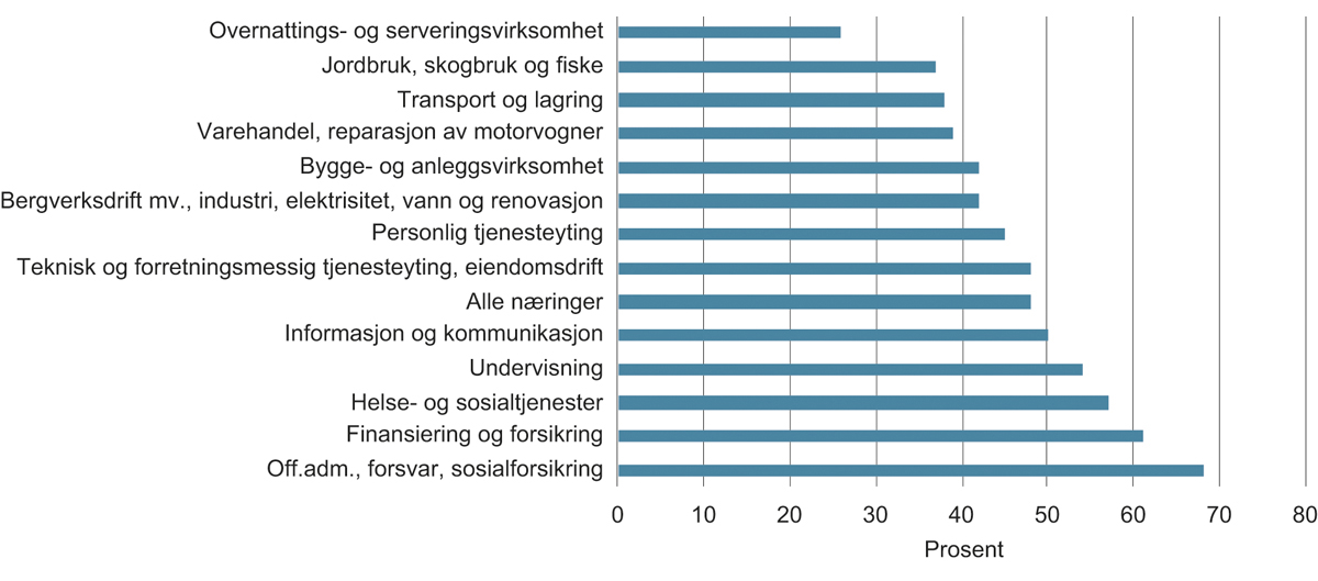 Også IT-bransjen mangler arbeidskraft med IKT-kompetanse (IKT-Norge, 2017). I IKT-Norges kompetanseundersøkelse for 2017 svarte hele 38 prosent av respondentene17 at de har ledige IT-stillinger de ikke har fått besatt i løpet av det siste året. 52 prosent svarte at det er ganske vanskelig å få tak i personer med kvalifisert IKT-kompetanse. Undersøkelsen viste at 42 prosent av de som ikke fikk besatt ledige IT-stillinger det siste året måtte si nei til ordre og dermed tapte inntekt. Det indikerer at vanskeligheter med å rekruttere IKT-kompetanse kan hindre vekst og konkurranseevne.