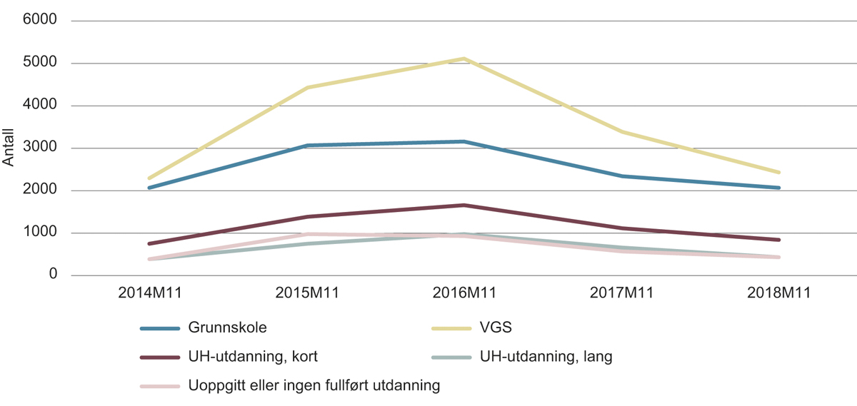 Fra juni 2014 til januar 2016 falt oljeprisen fra 115 til 28 dollar fatet (Oslo børs, 2019). Det førte til et kraftig fall i investeringer, slik at norske produsenter og leverandører måtte nedbemanne kraftig (Hvinden & Nordbø, 2016). Ledigheten økte markant på Sør- og Vestlandet, hvor det er mye næring tilknyttet petroleumsvirksomhet. Rogaland opplevde den sterkeste ledighetsøkningen. Registrerte ledige i fylket økte for alle utdanningsnivåer, og det var flest ledige med utdanning på videregående opplærings-nivå (figur 7.1). Samtidig var den relative veksten i ledige størst blant personer med mastergrad.