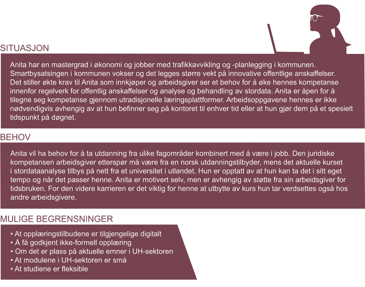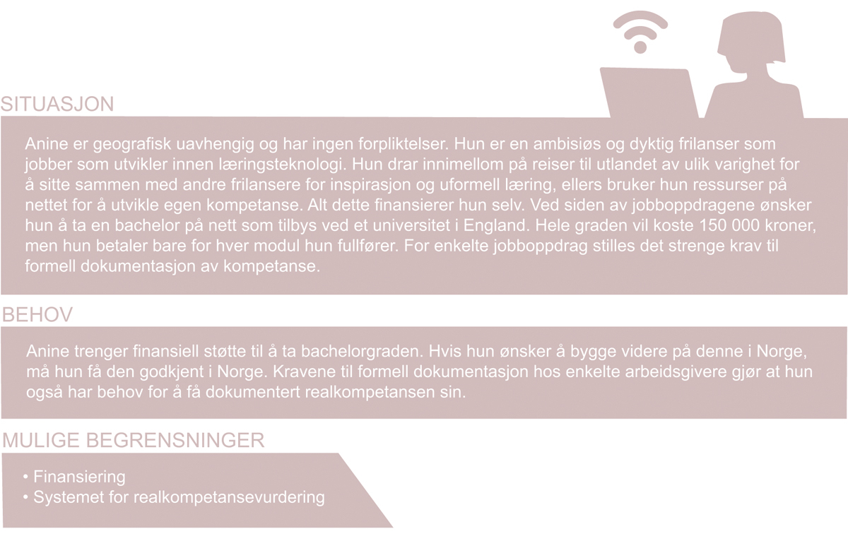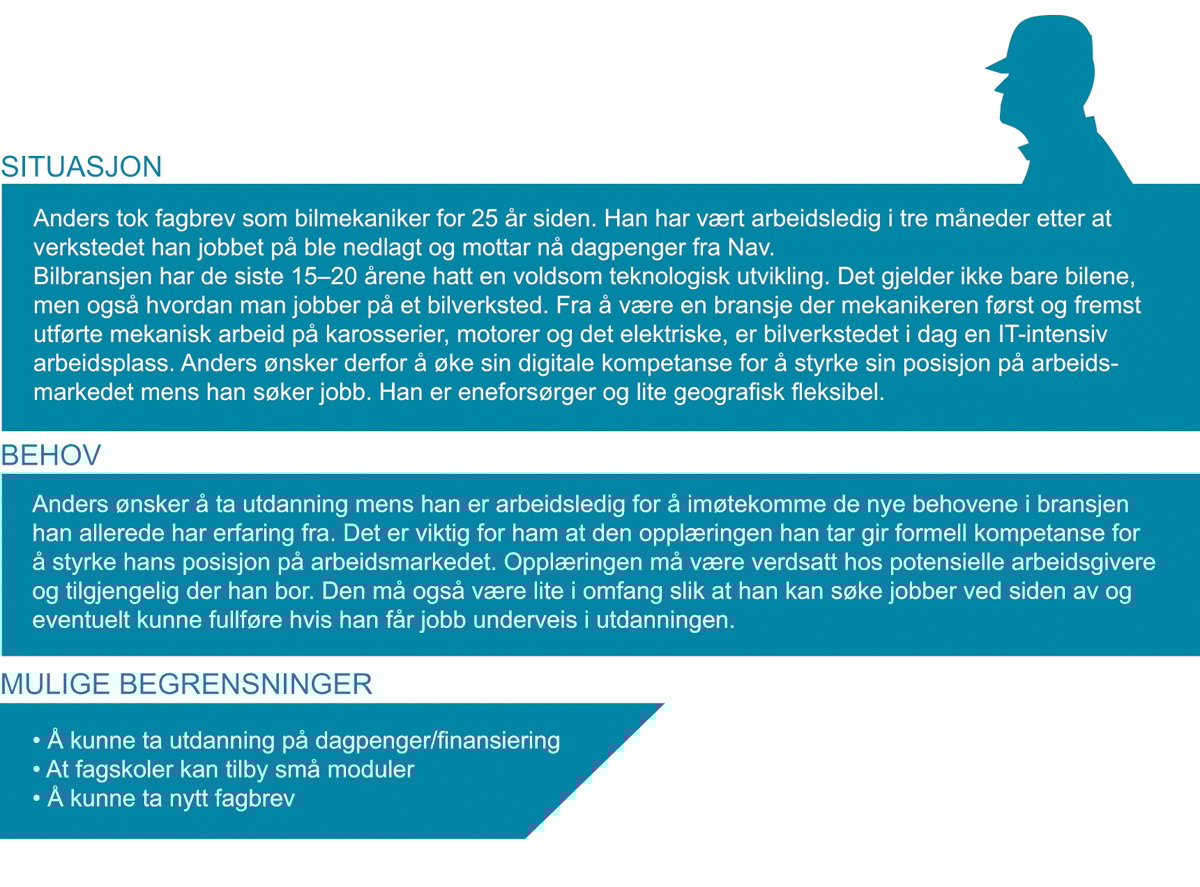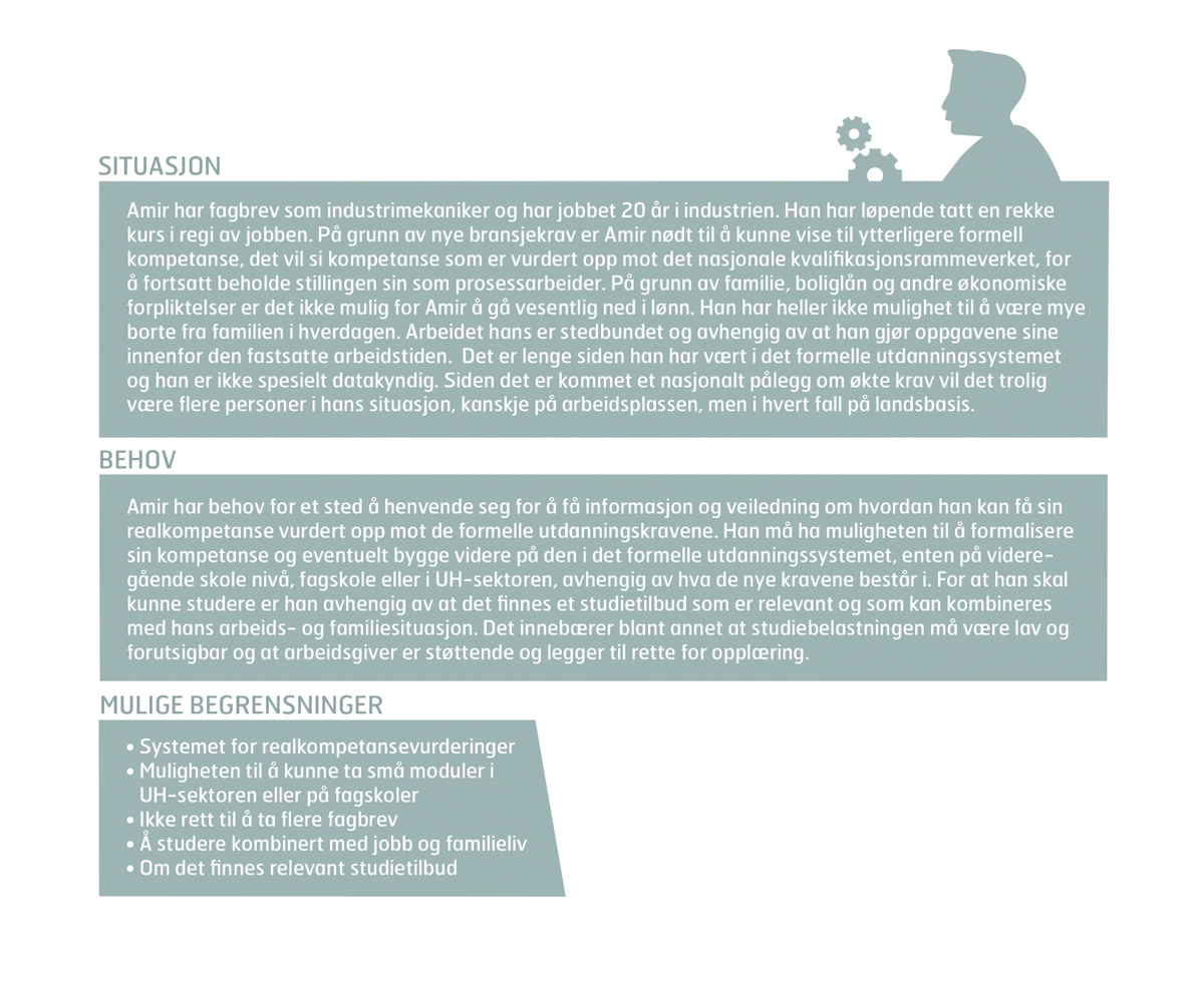 Det kan være mange grunner til at voksne har behov for å formalisere eller tilegne seg ny kompetanse. Under følger noen eksempler som illustrerer ulike livssituasjoner man kan befinne seg i, hvilke behov man kan ha og noen av utfordringene man vil møte i dagens system. Eksemplene er rendyrket for å illustrere fire ulike behov: formalisering av kompetanse, kompetanseheving, omstilling, og fleksibilitet. I realiteten vil en person kunne ha mer overlappende behov enn hva eksemplene viser. I kapittel 9 gir vi noen eksempler som illustrerer ulike bedriftsbehov.