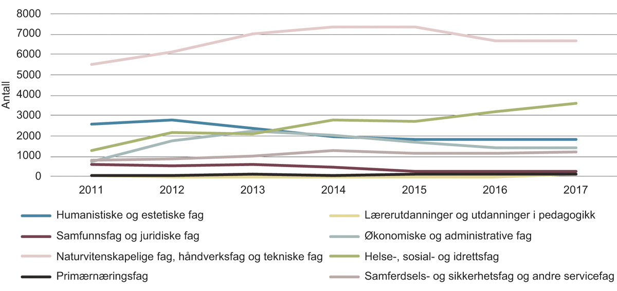 I dag er det om lag 15 000 fagskolestudenter i Norge. Dette antallet har vært relativt stabilt de seneste årene, men med en liten vekst fra 2016 til 2017. Nå skal det også trappes opp med 1 276 nye studieplasser fram til 2020 (Kunnskapsdepartementet, 2018e). Det er tenkt at studieplassene skal øke særlig innenfor helsefagene og de tekniske fagene. Som vist i figur 11.1, er helsefagene og de tekniske fagene de mest populære fagfeltene, hvor helsefagene har hatt en økning med årene.