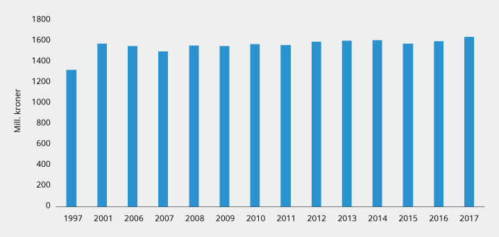 Satsene i naturressursskatten har ligget fast siden 1998, da satsen til kommunene ble økt fra 1,0 til 1,1 øre per kWh. Vannkraftproduksjonen som inngår i grunnlaget for naturressursskatt har endret seg lite, og provenyet fra skatten har vært stabilt siden begynnelsen av 2000-tallet, jf. figur 11.1. For å gi stabile inntekter beregnes naturressursskatten ut fra gjennomsnittlig produksjon de siste syv år. Skatten påvirkes dermed også lite av variasjon mellom våt- og tørrår og er helt uavhengig av kraftprisen.