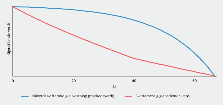 Det økonomiske verdifallet kan illustreres ved å se på utviklingen i markedsverdi for et modellkraftverk, anslått som nåverdi av gjenstående kontantstrøm før skatt. Kraftverk vil ha en stabil produksjon over levetiden og verdifallet vil dermed være lavt i første del av produksjonsperioden. Figur 11.2 tar utgangspunkt i et modellkraftverk med 67 års levetid. Nåverdien av fremtidig kontantstrøm er sammenlignet med skattemessig gjenstående verdi med dagens avskrivningsregler. Det fremgår at dagens avskrivningsregler gir selskapene tidligere fradrag enn det økonomiske verdifallet.
