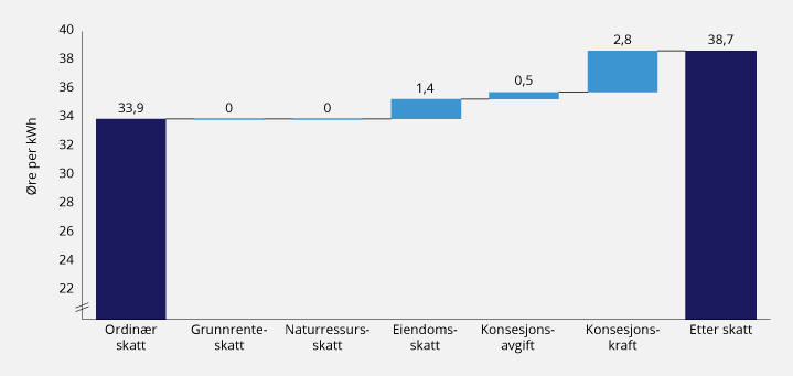 I figur 2.1 er det illustrert hvordan skatter, konsesjonskraft og konsesjonsavgift vil påvirke selskapenes lønnsomhetsvurderinger av en investering i et stort vannkraftverk. Figuren viser hvilken salgspris (balansepris) som i dette eksemplet er nødvendig for at investeringen skal være lønnsom for selskapene etter skatter, konsesjonskraft og konsesjonsavgift. Den nøytrale grunnrenteskatten og naturressursskatten øker ikke selskapenes balansepris. Konsesjonskraft, konsesjonsavgift og eiendomsskatt har egenskaper som bruttoavgifter og øker selskapenes krav til salgspris for at investeringen skal være lønnsom.