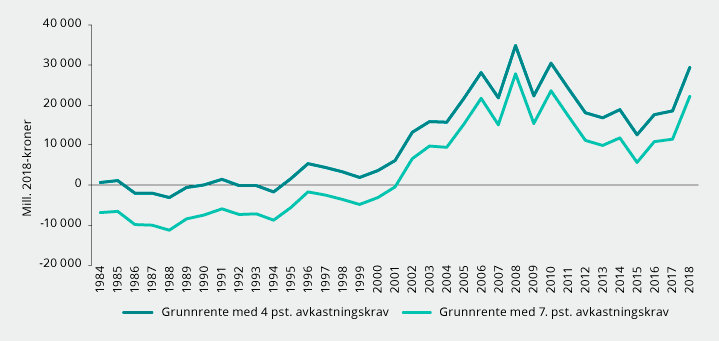 Figur 3.12 Beregnet grunnrente med 4 og 7 pst. avkastningskrav. Mill 2018-kroner