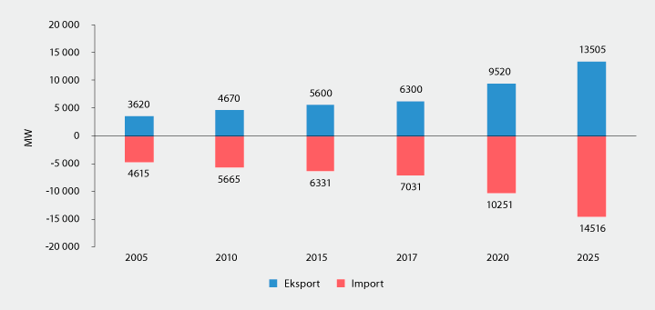 Figur 3.13 viser summen av anslått utvekslingskapasitet fra nordiske land til land utenfor Norden. Import er større enn eksport da enkelte overføringslinjer bare brukes til import.