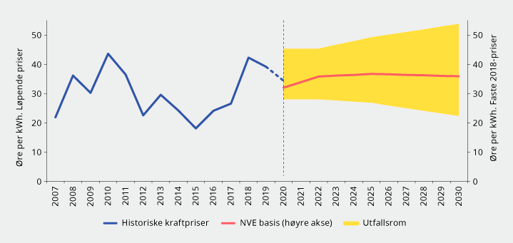 Figur 3.14 viser utviklingen i historiske kraftpriser, terminpriser for 2020 og NVEs fremskrivinger fra 2020. NVEs basisframskriving, fra oktober 2018, anslår at kraftprisen i Norge i gjennomsnitt stiger fra 2020 til 2025 før utviklingen flater ut mot 2030. Utfallsrommet er likevel stort, og de regionale forskjellene i Norge kan være betydelige. Prisøkningen skyldes forutsetningen om høyere CO2-priser og idriftsettelsen av nye kabler fra Norden til Storbritannia. På tross av en stigende CO2-pris i hele perioden, bidrar økt fornybarproduksjon i Europa og et større kraftoverskudd i Norden til at gjennomsnittsprisene er relativt stabile utover i perioden mot 2030. NVEs høy- og lavalternativ for prisutviklingen, illustrert ved det skraverte området i figur 3.14, tar utgangspunkt i ulike forutsetninger.4