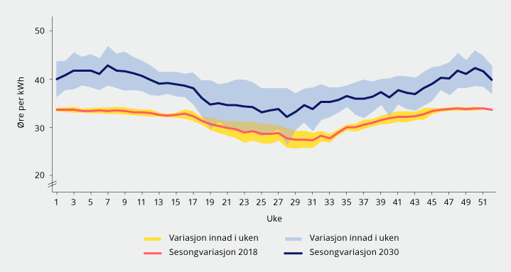 Foreløpig er ikke denne utviklingen like sterk i Norge, men kan bli mer fremtredende i årene fremover. Det gjelder spesielt i Sør-Norge som er nærmest knyttet til kraftmarkedet på kontinentet. Nettbegrensninger gjør at priseffekten lengre nord i landet vil bli mindre. Kraftprisvariasjonene er illustrert i figur 3.15, der linjene viser anslått utvikling i kraftprisen i Sør-Norge over året i 2018 og 2030. Det skraverte området viser prisvariasjonen innad i uken, og illustrerer at prisvariasjonen innad i uken er forventet å stige markant fra 2018 til 2030.